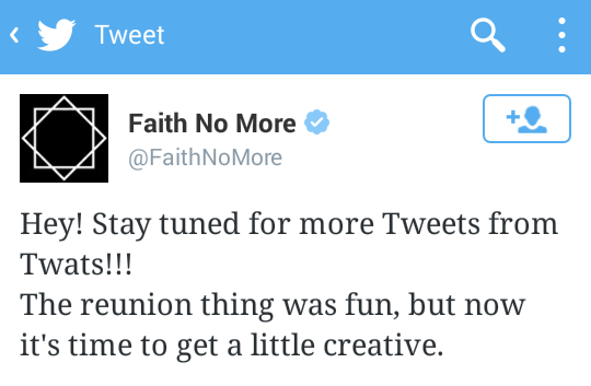 Faith No More just made an official Twitter and made a tweet that seems to suggest new material. The tweet said the band was going to get “a little creative,” and people are thinking this could could be a hint of new music in the future.