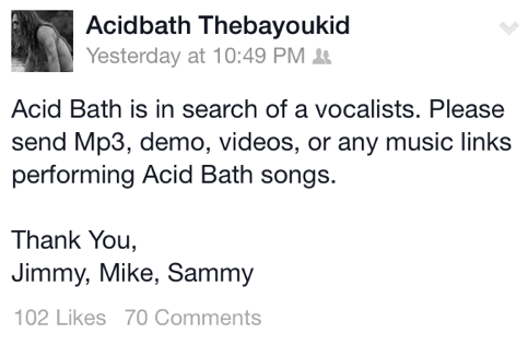“In response to the post by ‘Acidbath The Bayou Kid’ on June 3rd, 2014, I’d like to clarify a few things: [Drummer] Jimmy Kyle created that post without prior discussion with [guitarist] Mike Sanchez or myself [guitarist, Sammy Duet]. ACID BATH is not looking for a vocalist. There is no ACID BATH without [late bassist] Audie Pitre, so there will never be ‘new’ ACID BATH material.