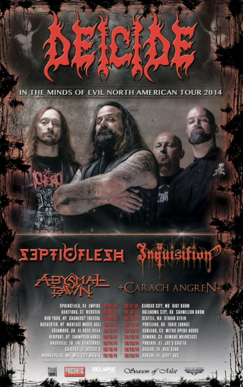 According to Metal Injection, Deicide have announced a Fall headlining tour. They will also be joined by Septicflesh, Inquisition, Abysmal Dawn and Carach Angren.