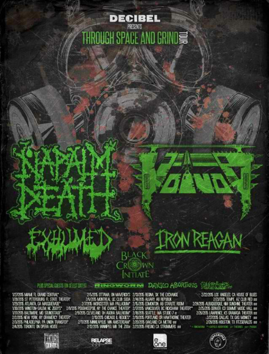 Napalm Death and Voivod have announced 2015 North American tour together, called the “Through Space And Grind Tour.” The tour will also feature Iron Reagan, Exhumed, and Black Crown Initiate. Ringworm, Dayglo Abortions, Theories and Phobia will also perform on select dates.