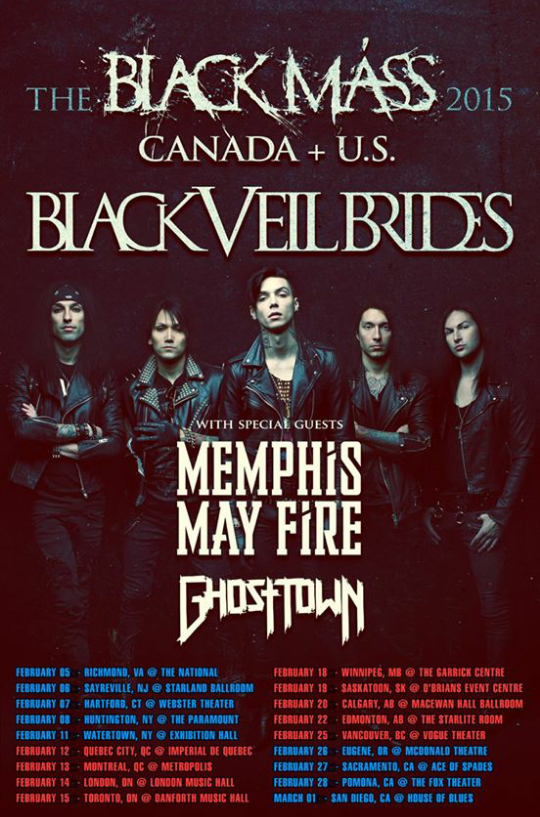 Black Veil Brides have announced a 2015 leg of their “Black Mass” tour. This time around, the supporting acts will be Memphis May Fire and Ghost Town.