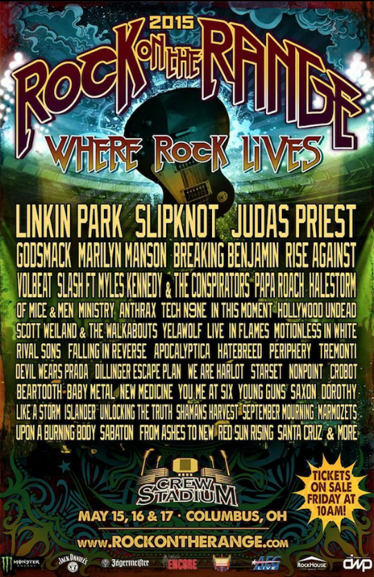 The lineup for the 2015 Rock On The Range has been announced. The festival will take place at Columbus Crew Stadium in Columbus, Ohio on May 15th-17th and will feature Slipknot, Judas Priest, Anthrax, Volbeat, Breaking Benjamin, Marilyn Manson, Linkin Park and many more.