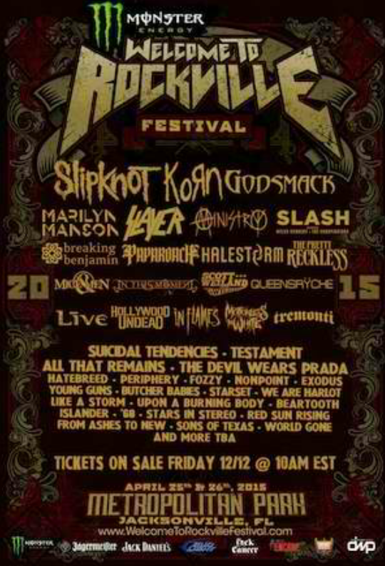 The lineup for the 2015 Welcome To Rockville Festival has been announced. The festival will take place on April 25 – 26, at Metropolitan Park in Jacksonville, Florida, and will include Slipknot, Korn, Slayer, Marilyn Manson, Slash, Breaking Benjamin and many more.