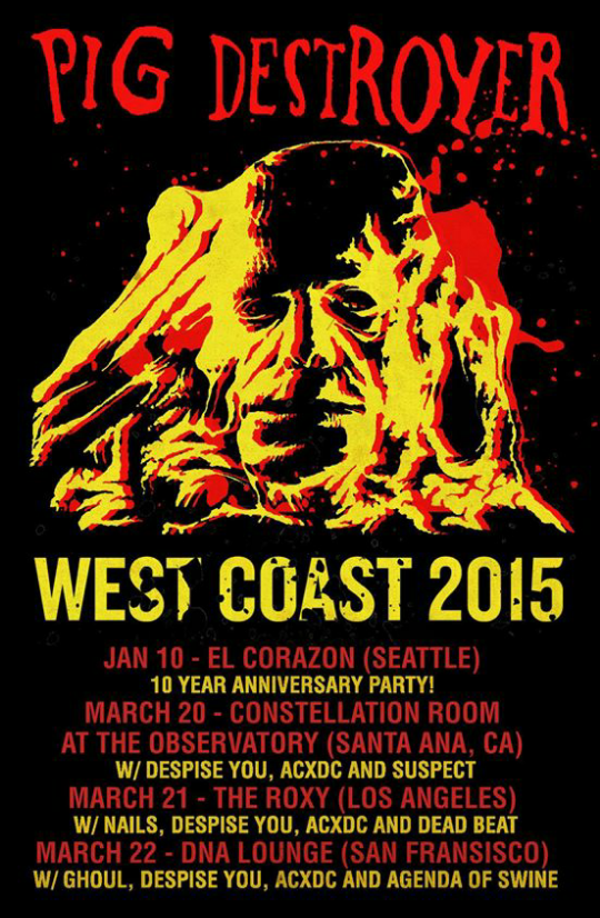 Pig Destroyer have announced a few 2015 West Coast dates. Supporting acts for this run include: Despise You, ACXDC, Suspect, Nails, Dead Beat, Ghoul, and Agenda Of Swine on select dates.