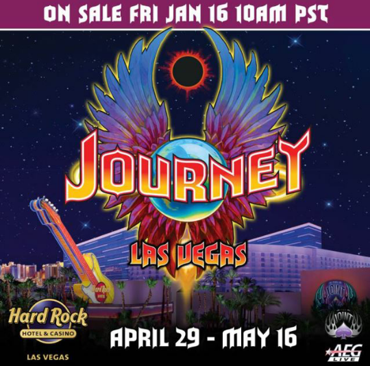 Journey have announced a Las Vegas residency. The band will perform at The Joint inside the Hard Rock Hotel & Casino, from April 29 – May 16. Tickets go on sale January 16 at www.axs.com/journeylasvegas. There will also be a fan club presale on January 7 and an AMEX presale on January 8.