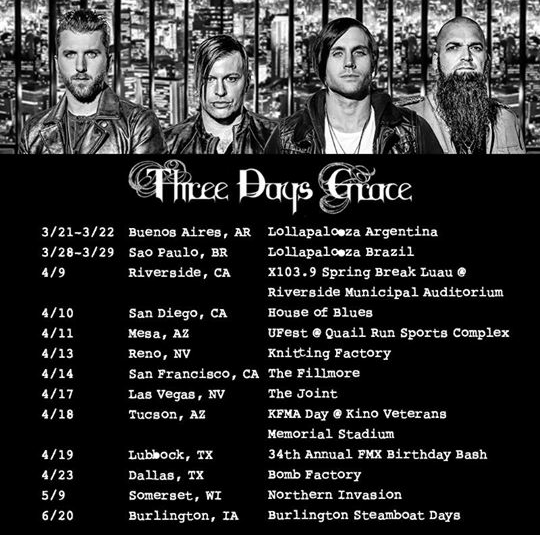Three Days Grace have announced some spring/summer tour dates. Tickets go on sale February 13.