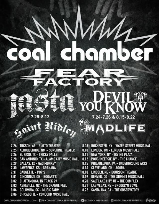 Coal Chamber have announced a summer headlining tour. The band will also be joined by special guests Fear Factory, Jasta (select dates), Devil You Know (select dates), Saint Ridley and Madlife.