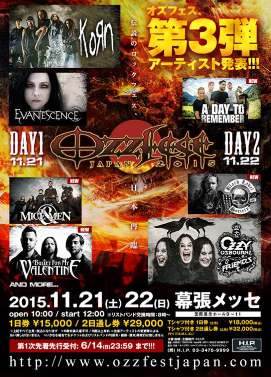 More acts have been confirmed for the 2015 Ozzfest Japan. The festival will take place November 21-22, in Makuhari Messe and the newly announced acts include: A Day To Remember, Black Label Society, Bullet For My Valentine and Of Mice & Men