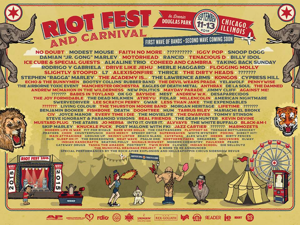 Against Me!, Alexisonfire, Alkaline Trio, American Nightmare, Andrew McMahon In The Wilderness, Andrew W.K., Anthrax, Atreyu, Babes In Toyland, Bayside, Benjamin Booker, Billy Idol, Bootsy Collin’s Rubber Band, Chicago Riot Fest, Civ, Coheed And Cambria, Cypress Hill, Damian “Jr. Gong” Marley, De La Soul, death, Desaparecidos, Dirty Heads, Doomtree, Drive Like Jehu, Eagles Of Death Metal, Echo & The Bunnymen, Every Time I Die, Faith No More, festival, Fidlar, Fishbone, Flogging Molly, Gwar, Hum, Ice Cube, Iggy Pop, Jimmy Cliff, Joyce Manor, Kongos, L7, Lee Scratch Perry, Less Than Jake, Lifetime, lineup, Living Colour, Manchester Orchestra, Mariachi El Bronx, Mayday Parade, Merle Haggard, Mest, Metal, Millencolin, Morgan Heritage, Motorhead, New Politics, No Doubt, Ok Go, Pennywise, Rancid, rap, reggae, RiotFest, Rock, Rodrigo y Gabriela, Slightly Stoopid, Snoop Dogg, Stephen “Ragga” Marley, Steve Ignorante & Paranoid Visions, Swervedriver, Taking Back Sunday, Tarrus Riley, Tenacious D, The Academy Is…, The Airborne Toxic Event, The Damned, The Dead Milkment, The Devil Wears Prada, The Dwarves, The Expendables, The Joy Formidable, The Lawrence Arms, The Movielife, The Thurston Moore Band, Thrice, Tommy Stinson, Yelawolf