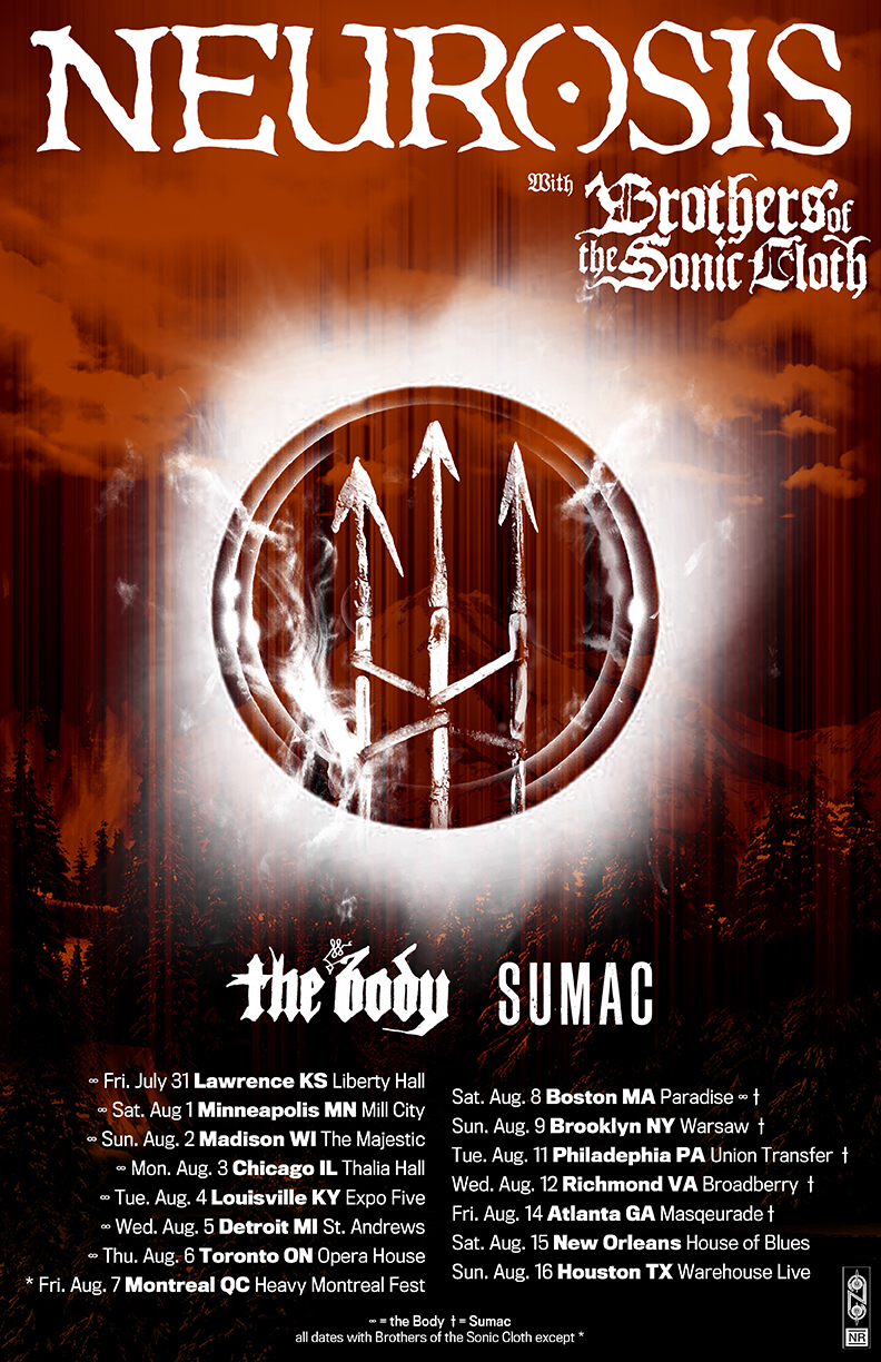 Neurosis have announced a summer North American tour. The band will also be joined by Brothers Of The Sonic Cloth, The Body (select dates) and Sumac (select dates).