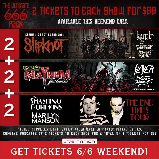 In other news, this weekend Mayhem Fest is having a 666 sale where fans can purchase six general admission tickets for $66. They have also teamed up with other tours for a similar deal, so fans can choose if they want six Mayhem tickets or two for Mayhem Fest, along with two tickets to Slipknot, Lamb Of God Etc. and two tickets to Marilyn Manson and Smashing Pumpkins.