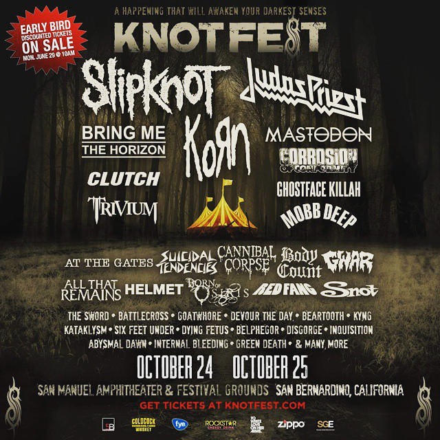 The initial lineup has been revealed for this year’s Knotfest. The festival will take place October 23-25, at San Manuel Amphitheater, in San Bernardino, CA, and will include: Slipknot, Judas Priest, Korn, Mastodon, Trivium, Corrosion Of Conformity, At The Gates, Body Count, Red Fang, Battlecross, Gwar, Born Of Osiris, The Sword, Goatwhore, Kataklsym, Belphegor, Inquisition, Abysmal Dawn, Bring Me The Horizon, Clutch, Ghostface Killah, Mobb Deep, Suicidal Tendencies, All that Remains, Kyng, Beartooth, Cannibal Corpse, Helmet, Snot, Devour The Day, Six Feet Under, Dying Fetus, Disgorge, Internal Bleeding, and Green Death.