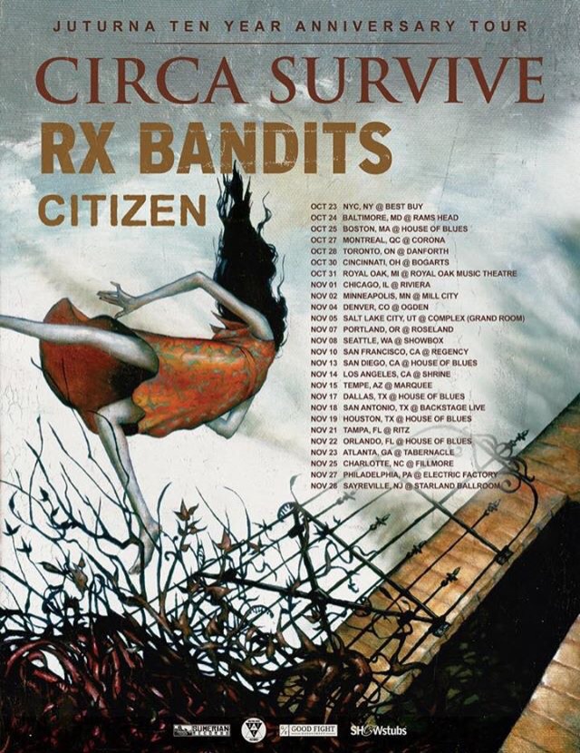 Circa Survive have announced a tour to commemorate the 10th anniversary of their album Juturna. The band will also be joined by Rx Bandits and Citizen for this run.