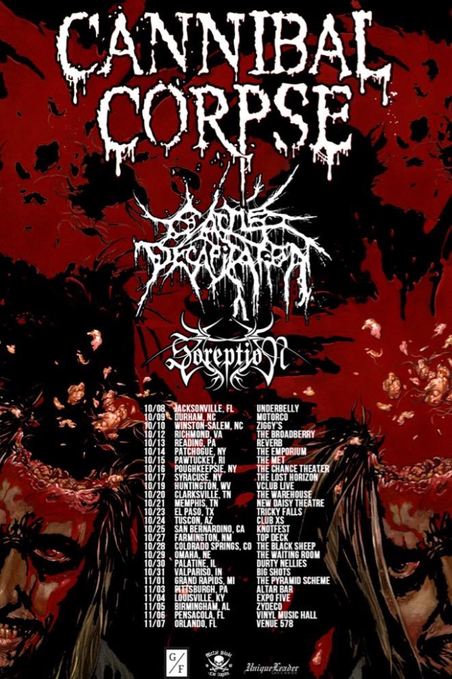 Cannibal Corpse have announced a fall headlining tour. The band will also be joined by special guests Cattle Decapitation and Soreption.