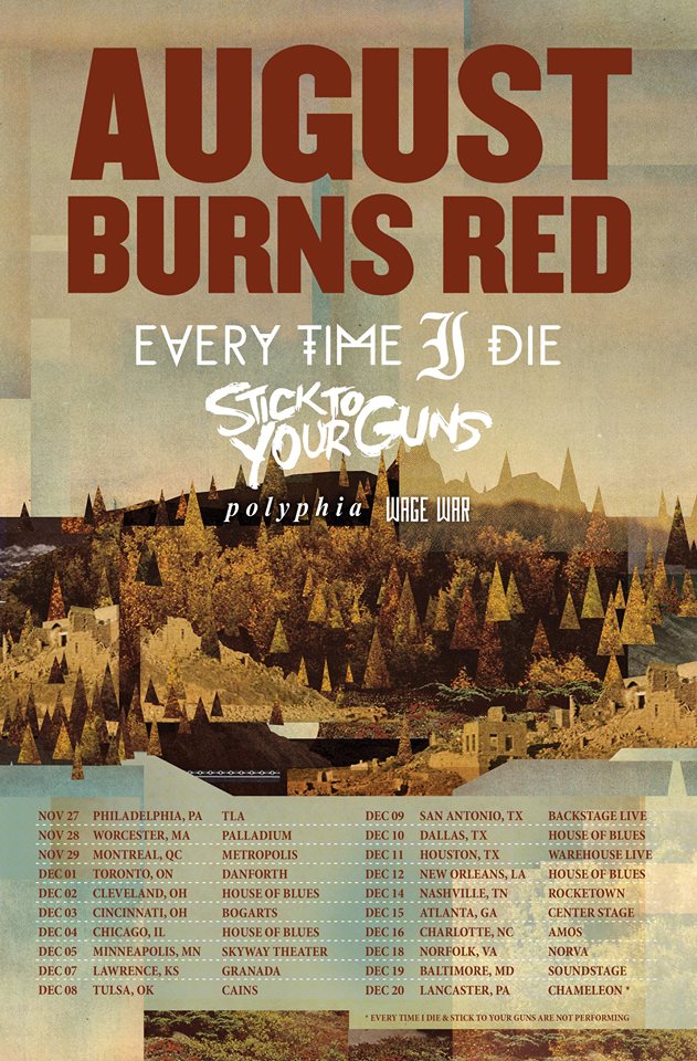 August Burn Red have announced a North American headlining tour. The band will also be joined by special guests Every Time I Die, Stick To Your Guns, Polyphia and Wage War.