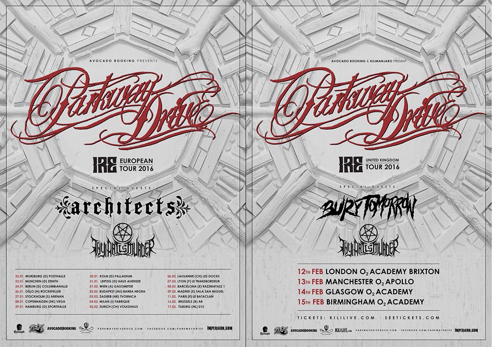 The supporting acts have been revealed for Parkway Drive’s 2016 tour. Thy Art Is Murder will be on board for the the whole tour, with Architects set for most dates, and Bury Tomorrow set for select dates.