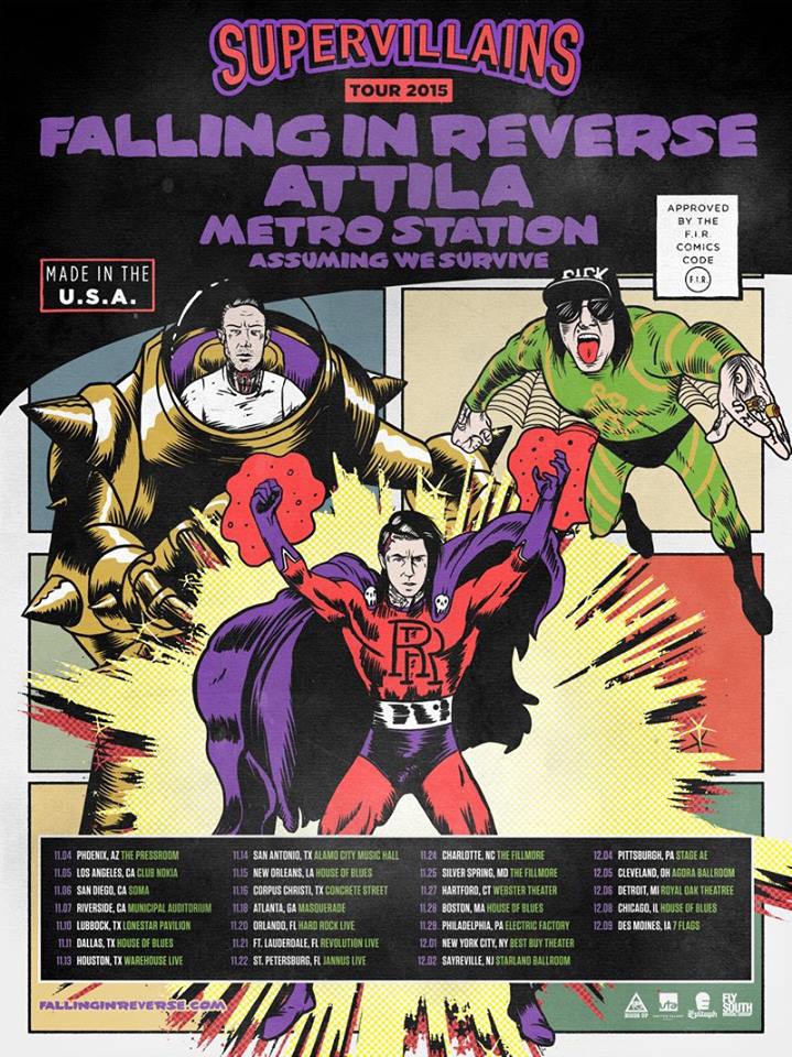 Falling In Reverse will be headlining the “Supervillains” tour this November/December. The band will also be joined by special guests Attila, Metro Station, and Assuming We Survive.