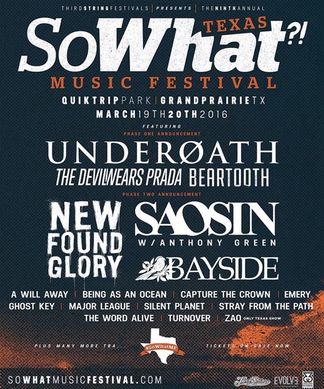 More acts have been confirmed for this year’s So What!? Music Festival. The event will take place at QuikTrip Park, in Grand Prairie, TX, on March 19-20, and the artists joining previously announced acts, Underoath, The Devil Wears Prada, and Beartooth, include: New Found Glory, Saosin (feat. Anthony Green), Bayside, A Will Away, Being As An Ocean, Capture The Crown, Emery, Ghost Key, Major League, Silent Planet, Stray From The Path, The Word Alive, Turnover, and Zao.