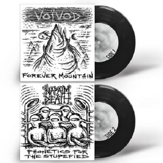Voivod have released a limited edition split 7″ with Napalm Death. The release features Voivod‘s “Forever Mountain,” along with Napalm Death‘s “Phonetics For The Stupefied,” and it is available on black (limited to 1200) (CM Distro Europe / USA) solid white (limited to 300) (CM Distro Europe), transparent red (limited to 700) (CM USA), and neon yellow (limited to 300) (Only available on the Deathcrusher tour) vinyl. You can buy that HERE.