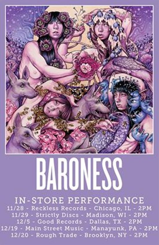 Baroness have announced some in-store performances to promote their new album, Purple, which will be released on December 18. People who preorder the effort get automatic entry, as well as a signed lithograph, featuring the album’s cover art.