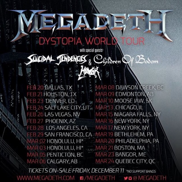 Megadeth have announced a 2016 North American tour. The band will also be joined by special guests Suicidal Tendencies, Children Of Bodom and Havok.