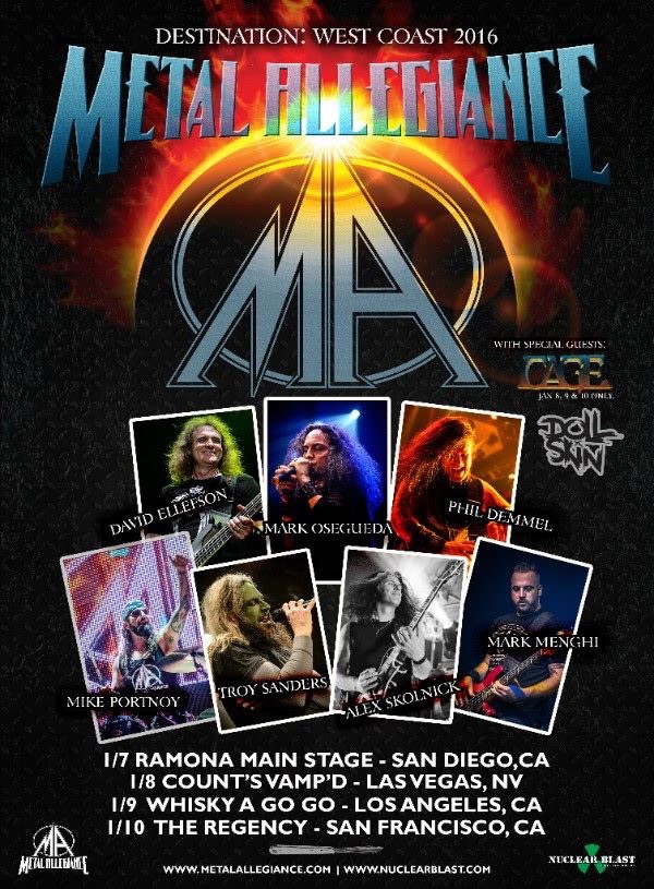 Metal Allegiance, the metal supergroup featuring core members David Ellefson (Megadeth), Alex Skolnick (Testament), Mike Portnoy (The Winery Dogs, ex-Dream Theater), and Mark Menghi, along with multiple special guests, have announced some 2016 West Coast shows. Confirmed guests joining the core members include: Phil Demmel (Machine Head), Mark Osegueda (Death Angel), and Troy Sanders (Mastodon). Supporting acts for this run will be Cage and Doll Skin.