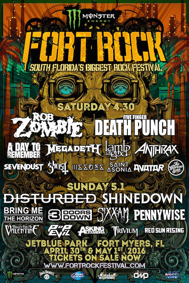 The lineup for the 2016 Monster Energy Fort Rock Festival has been revealed. That event will be held at JetBlue Park in Fort Myers, FL, on April 30-May 1, and will feature: Rob Zombie, Five Finger Death Punch, A Day To Remember, Megadeth, Lamb Of God, Anthrax, Sevendust, Ghost, Issues, Saint Asonia, Avatar, The Glorious Sons, Disturbed, Shinedown, Bring Me The Horizon, 3 Doors Down, Sixx:A.M., Pennywise, Bullet For My Valentine, Pop Evil, Asking Alexandria, Trivium, and Red Sun Rising.