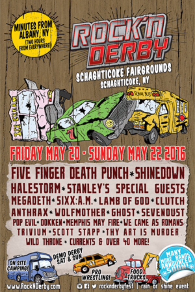 The initial lineup has been revealed for the 2016 Rock’n Derby Festival. The event will take place on May 20-22 at the Schaghticoke Fairgrounds in Schaghticoke, NY, and will include: Five Finger Death Punch, Shinedown, Halestorm, Megadeth, Sixx:A.M., Lamb Of God, Clutch, Anthrax, Wolfmother, Ghost, Sevendust, Pop Evil, Dokken, Memphis May Fire, We Came As Romans, Trivium, Scott Stapp, Thy Art Is Murder, Wild Throne, and Currents.