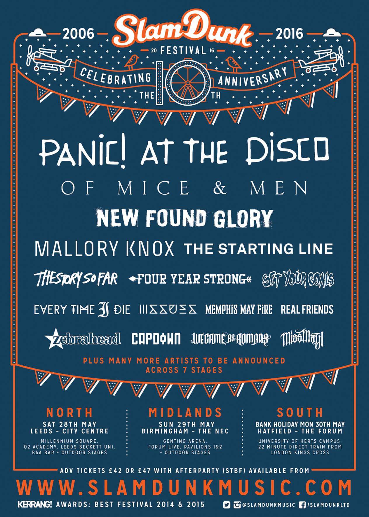 The lineup has been revealed for this year’s version of the UK Slam Dunk Festival. Confirmed artists include: Panic! At The Disco, Of Mice & Men, New Found Glory, Mallory Knox, The Starting Line, The Story So Far, Four Year Strong, Set Your Goals, Every Time I Die, Issues, Memphis May Fire, Real Friends, Zebrahead, Capdown, We Came As Romans, and Miss May I.