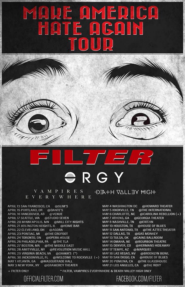 Filter have announced a 2016 headlining tour. The band will also be joined by special guests Orgy, Vampires Everywhere!, and Death Valley High.
