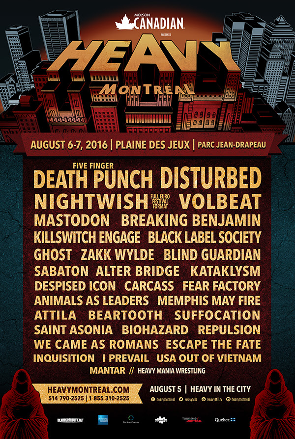 The initial ineup has been revealed for Heavy Montreal. The festival will take place at Parc Jean-Drapeau, in Montreal, QC from August 6-7 and will include: Five Finger Death Punch Disturbed, Nightwish, Volbeat, Mastodon, Breaking Benjamin, Killswitch Engage, Black Label Society, Ghost, Zakk Wylde, Blind Guardian, Sabaton, Alter Bridge, Kataklysm, Despised Icon, Carcass, Fear Factory Animals As Leaders, Memphis May Fire, Attila, Beartooth, Suffocation, Saint Asonia, Biohazard, Repulsion, We Came As Romans, Escape The Fate, Inquisition, I Prevail, USA Out Of Vietnam, and Mantar.