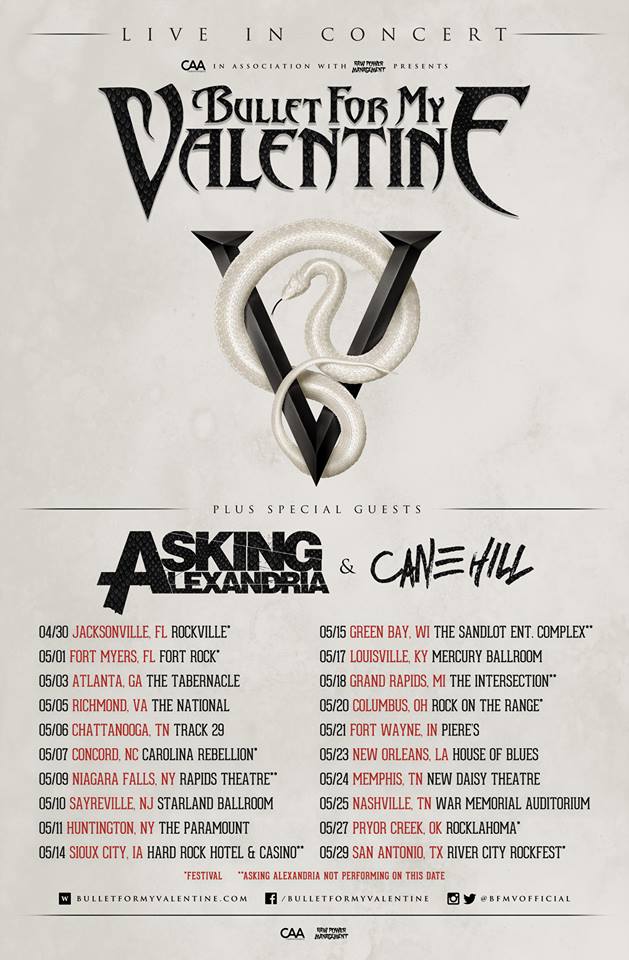 Bullet For My Valentine have announced a spring headlining tour. The band will also be joined by special guests Asking Alexandria, and Cane Hill.