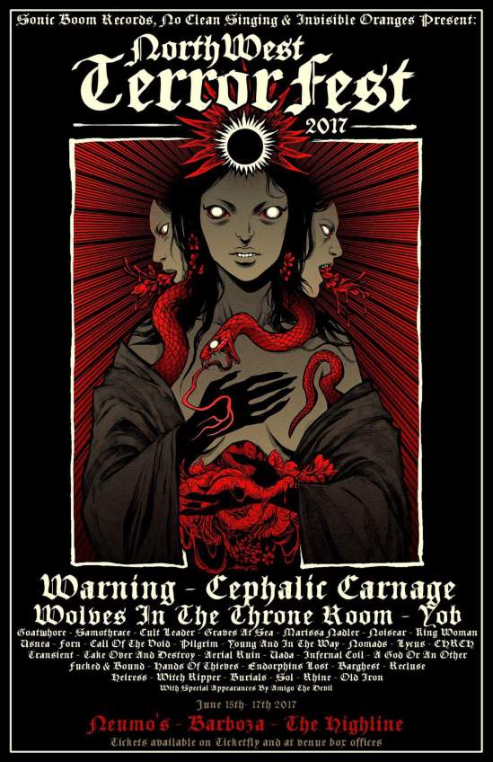 The lineup has been revealed for the 2017 Northwest Terror Fest. The event will take place at multiple venues in Seattle, WA on June 15-17 and it will include: Wolves In The Throne Room, Samothrace, King Woman, Lycus, Uada, Graves At Sea, Pilgrim, Take Over & Destroy, Barghest, With Rippee, Cephalic Carnage, Goatwhore, Noisear, Nomads, Fucked & Bound, Cult Leader, Call Of The Void, Transient, Endorphin’s Lost, Recluse, Warning, YOB, Marissa Nadler, Young & In The Way, Infernal Coil, Forn, CHRCH, Hands Of Thieves, and A God Or An Other.