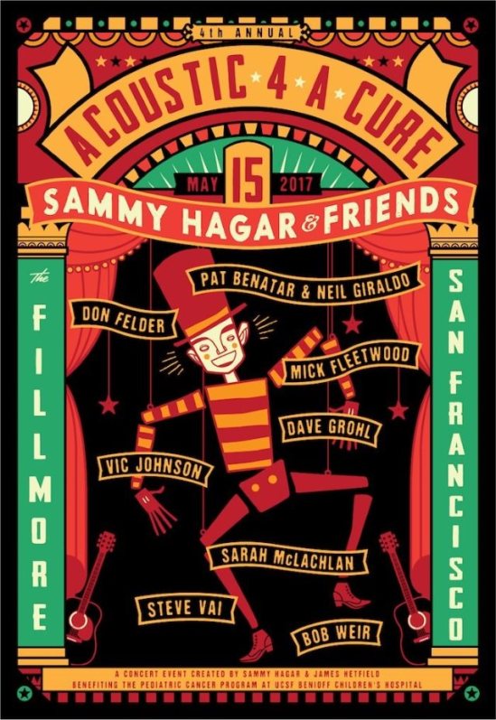 Pat Benatar & Neil Giraldo, Don Felder (ex-Eagles), Mick Fleetwood (Fleetwood Mac), Dave Grohl (Foo Fighters), Sammy Hagar, Vic Johnson (The Circle, etc.), Sarah McLachlan, Steve Vai, and Bob Weir (Grateful Dead) have been set for the fourth annual Acoustic 4 A Cure benefit. This special acoustic show benefits the Pediatric Cancer Program at UCSF Benioff Children’s Hospital and will be held at The Fillmore in San Francisco, CA, on May 15. The event usually features James Hetfield as well, but with Metallica’s busy tour schedule Grohl was recruited to fill in.
