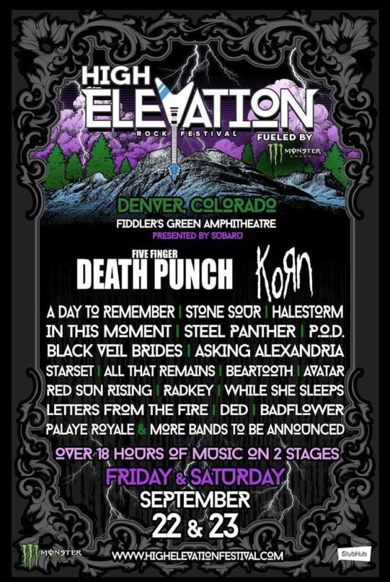 The lineup has been revealed for the 2017 High Elevation Rock Festival. The event will take place on September 22-23 at Fiddler’s Green Amphitheatre in Denver, CO, and it will include: Five Finger Death Punch, Korn, A Day To Remember, Stone Sour, Halestorm, In This Moment, Steel Panther, Black Veil Brides, Asking Alexandria, Starset, P.O.D., All That Remains, Beartooth, Avatar, Red Sun Rising, Radkey, While She Sleeps, Letters From The Fire, DED, Palaye Royale, and Badflower.
