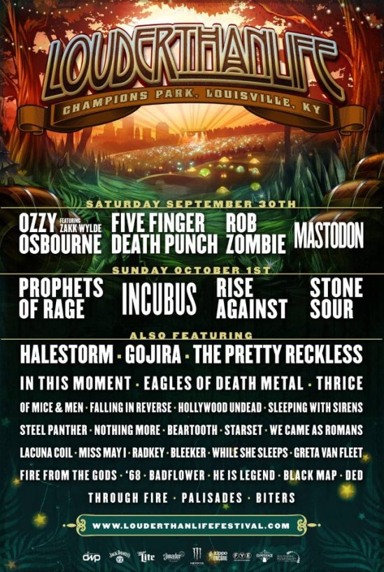 The lineup has been revealed for this year’s Louder Than Life festival. The festival will take place September 30 – October 1, in Louisville, KY and it will include: Ozzy Osbourne, Five Finger Death Punch, Rob Zombie, Mastodon, Halestorm, Gojira, Eagles Of Death Metal, Of Mice & Men, Hollywood Undead, Sleeping With Sirens, Steel Panther, Starset, We Came As Romans, Miss May I, While She Sleeps, Fire From The Gods, He Is Legend, DED, Through Fire, Palisades, Prophets Of Rage, Incubus, Rise Against, Stone Sour, The Pretty Reckless, In This Moment, Thrice, Falling In Reverse, Nothing More, Beartooth, Lacuna Coil, Radkey, Bleeker, Greta Van Fleet, ’68, Badflower, Black Map, and Biters.