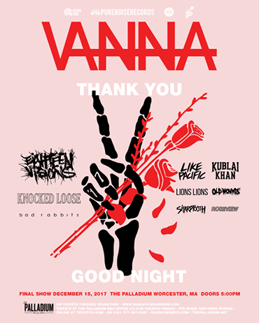 Vanna have confirmed the supporting acts for their final show, which is set to take place on December 15 at The Palladium in Worcester, MA. The following artists will perform: Eighteen Visions, Knocked Loose, Bad Rabbits, Like Pacific, Kublai Khan, Lions Lions, Old Wounds, Sharptooth, and Roseview.