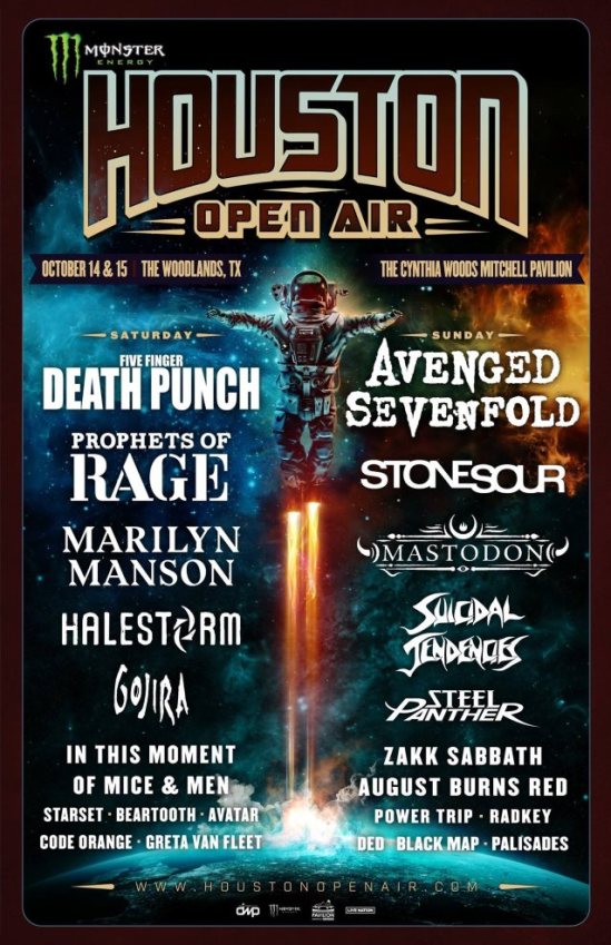 October 15: Avenged Sevenfold, Stone Sour, Mastodon, Suicidal Tendencies, Steel Panther, Zakk Sabbath, August Burns Red, Power Trip, Radkey, Ded, Black Map, and Palisades.
