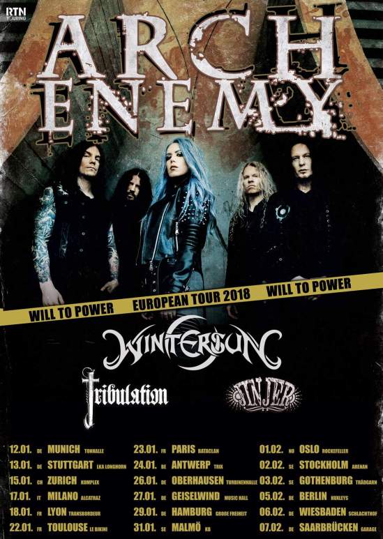 Arch Enemy have announced a 2018 European tour with Wintersun, Tribulation, and Jinjer. The band will be out in support of their new album “Will To Power,“ which will be released on September 8.