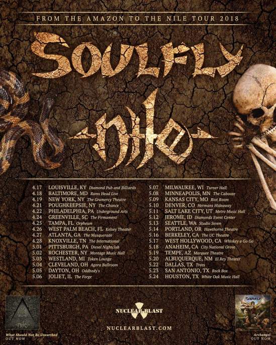 “We are thrilled to have the opportunity to bring Nile fans in the States a last round of touring supporting the ‘What Should Not Be Unearthed‘ album. Teaming up with Soulfly is going to make for a killer package sure to please Metal Fans.