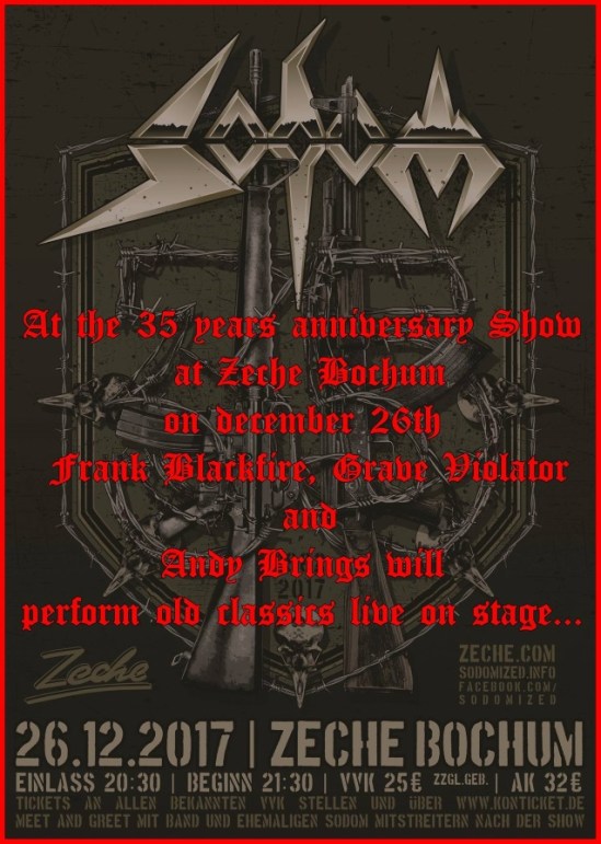 Sodom have announced that they will be rejoined by former guitarists Josef “Grave Violator” Dominik, Frank “Blackfire” Gosdzik, and Andy Brings during their upcoming 35th anniversary show. That set will take place on December 26 at Zeche in Bochum, Germany.