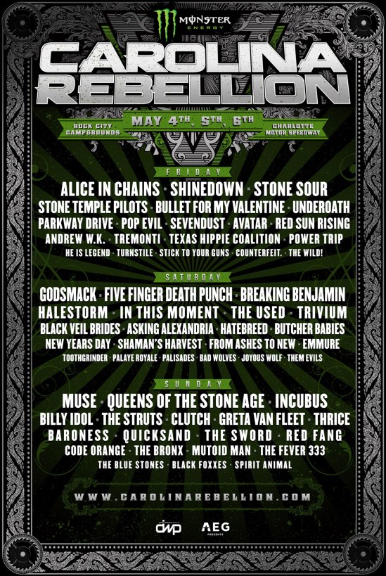 The 2018 Monster Energy Carolina Rebellion has officially been announced. The event will take place on May 4-6 at the Rock City Campgrounds at the Charlotte Motor Speedway in Charlotte, NC, and the daily lineups can be seen below: