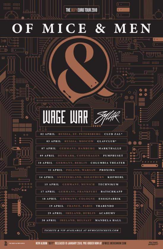 Of Mice & Men have announced a European headlining tour with Wage War and Sylar. The band will be out in support of their new album “Defy“ (out January 19).
