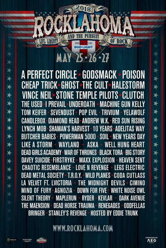The lineup has be revealed for the 2018 Rocklahoma festival. The event will take place in Pryor, OK on May 25-27, and it will feature all of the following: A Perfect Circle, Godsmack, Poison, Cheap Trick, Ghost, The Cult, Halestorm, Vince Neil, Stone Temple Pilots, Clutch, The Used, I Prevail, Underoath, Machine Gun Kelly, Tom Keifer, Sevendust, Pop Evil, Trivium, Yelawolf, Candlebox, Diamond Head, Andrew W.K., Red Sun Rising, Lynch Mob, Shaman’s Harvest, 10 Years, Adelitas Way, Butcher Babies, Powerman 5000, SOiL, New Years Day, Like A Storm, Wayland, Aska, Well Hung Heart, Dead Girls Academy, War Of Thrones, Black Tora, Big Story, Davey Suicide, Firstryke, Maxx Explosion, Heaven Sent, Chaotic Resemblance, Love In Revenge, Legs Electric, Dead Metal Society, T.R.O.Y., Wild Planes, Coda Cutlass, LA Velvet ft. LVictoria, The Midnight Devils, Cimino, Mind Of Fury, Agnozia, Down For Five, White Noise Owl, Silent Theory, Maplerun, Ryder, Kevlar, Dark Avenue, The Maension, Dead Horse Trauma, Renegades, Oddfellas, Bringer, and Stanley’s Revenge.