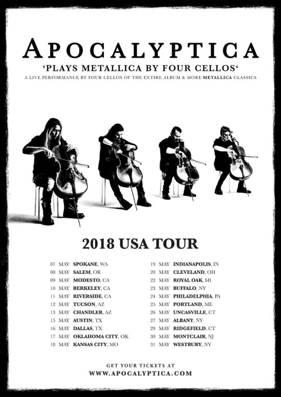 Apocalyptica previously celebrated the 20th anniversary of “Plays Metallica By Four Cellos” with a remastered re-release in 2016 and several tours around it. Now, the band will continue the celebration with a 2018 U.S. tour.