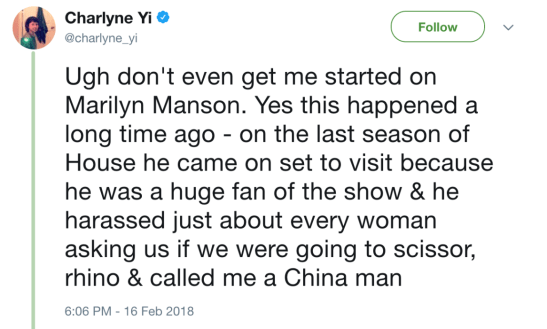 In the wake of Marilyn Manson’s recent onstage meltdown in Huntington, New York, actress/comedian Charlyne Yi has taken to Twitter to accuse the frontman of sexual harrasment and racist comments. According to her, when Manson visited the set of “House” years back “he harassed just about every woman” and even called her a “China man.” Yi’s tweets have since been deleted, but some screenshots of them can be found below: