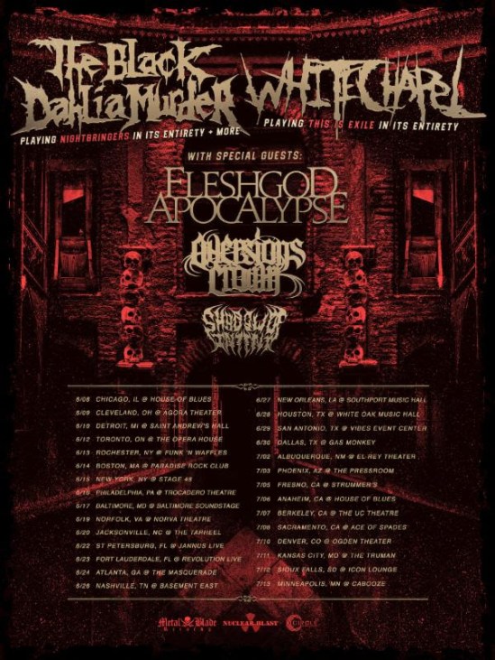 The Black Dahlia Murder and Whitechapel have announced a special co-headlining tour with Fleshgod Apocalypse, Aversions Crown, and Shadow Of Intent. This trek will feature The Black Dahlia Murder performing “Nightbringers” in its entirety and Whitechapel performing “This Is Exile” in its entirety.