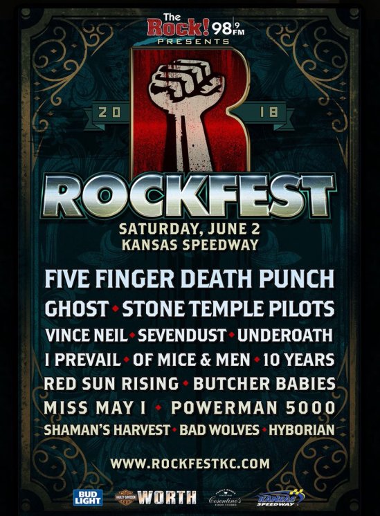 The lineup has been revealed for the 2018 Kansas City Rockfest. The event will take place at Kansas Speedway in Kansas City, KS on June 2 and it will include: Five Finger Death Punch, Ghost, Stone Temple Pilots, Vince Neil, Sevendust, Underoath, I Prevail, Of Mice & Men, 10 Years, Red Sun Rising, Butcher Babies, Miss May I, Powerman 5000, Shaman’s Harvest, Bad Wolves, and Hyborian.
