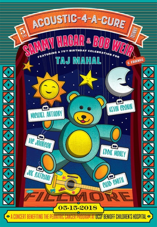 Sammy Hagar, Bob Weir, Joe Satriani, Chad Smith, Michael Anthony, Kevin Cronin, Eddie Money, and Vic Johnson have all been confirmed for the fifth annual Acoustic 4 A Cure benefit. This special acoustic show, which benefits the Pediatric Cancer Program at UCSF Benioff Children’s Hospital, will serve as 75th birthday celebration for blues icon Taj Mahaland. The concert will be held at The Fillmore in San Francisco, CA on May 15. James Hetfield (Metallica) used to co-host the event alongside Hagar, but Weir is now taking his place.