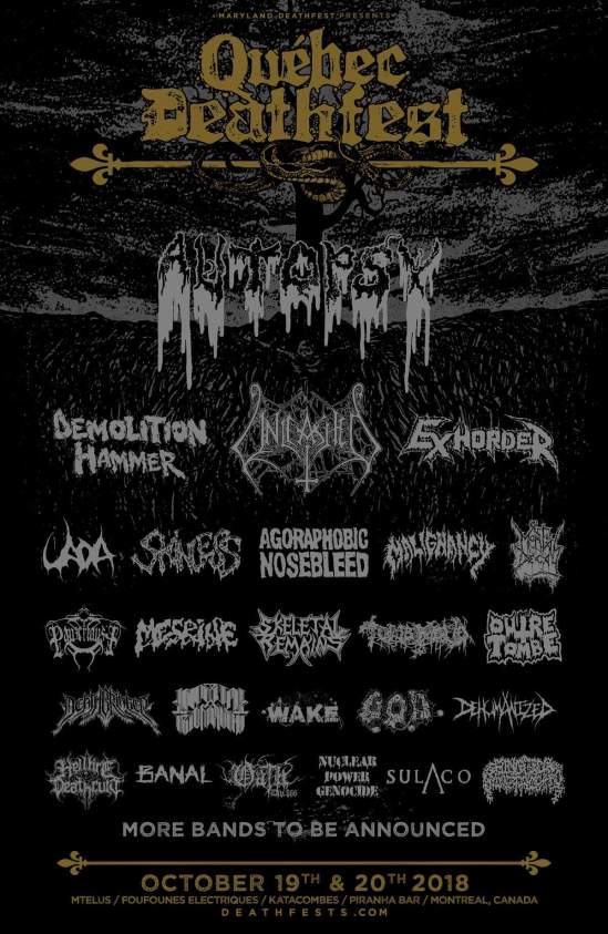 More bands have been added to the inaugural Quebec Deathfest in Montreal, Quebec. The event will take place on October 19-20 at Mtelus, Foufounes Electriques, Katacombes and the Piranha Bar, and the updated lineup includes all of the following: Agoraphobic Nosebleed, Autopsy, Banal, Biological Monstrosity, Deathbringer, Dehumanized, Demolition Hammer, Exhorder, Grotesque Organ Defilement, Hellfire Deathcult, Imperial Triumphant, Malignancy, Mesrine, Mortal Decay, Nuclear Power Genocide, Oath Div. 666, Outre-Tombe, Panzerfaust, Skeletal Remains, Skinless, Sulaco, Tomb Mold, Uada, Unleashed, and Wake.